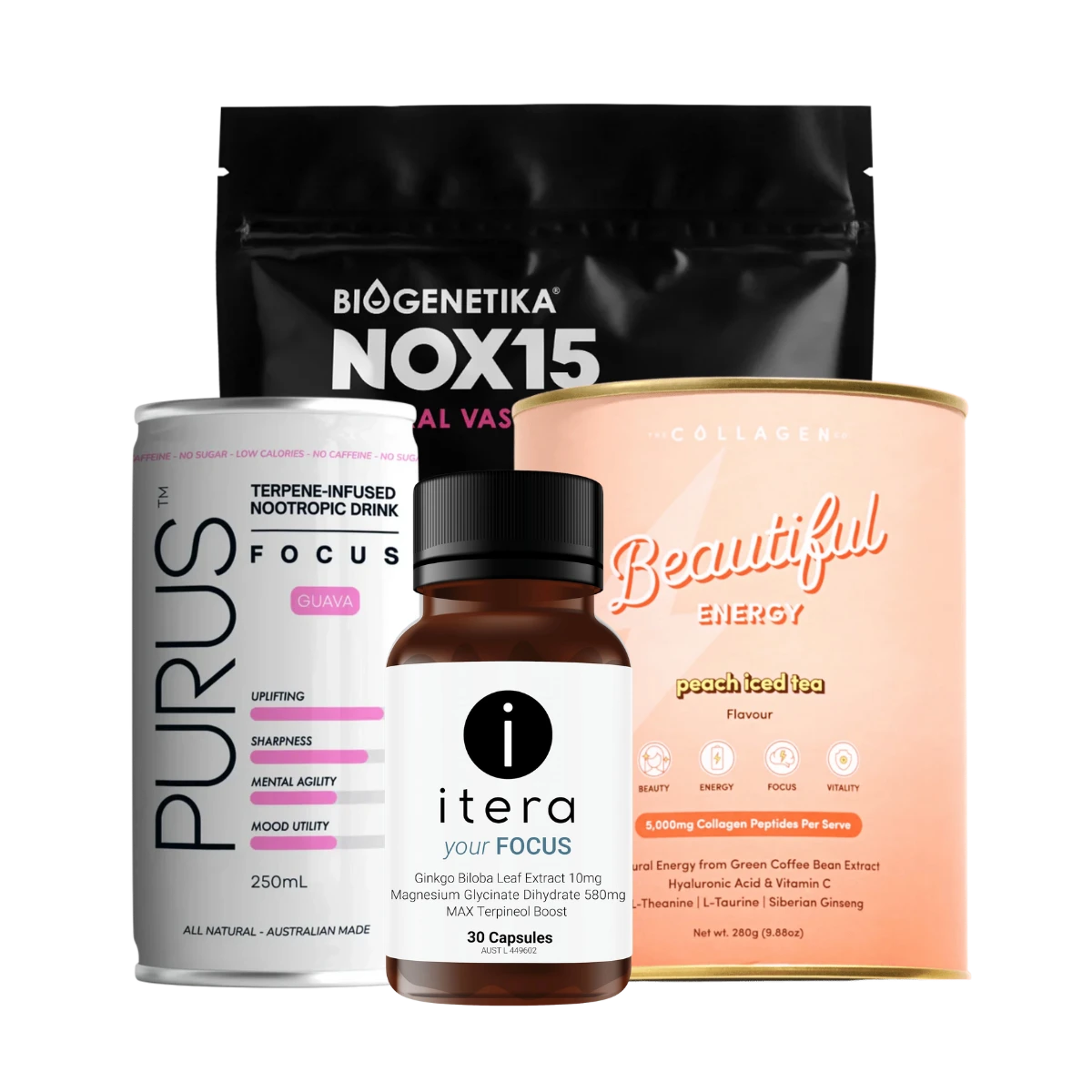 This bundle brings together four premium products that work synergistically to fuel your day from every angle: circulation, cognition, and clean, functional energy.